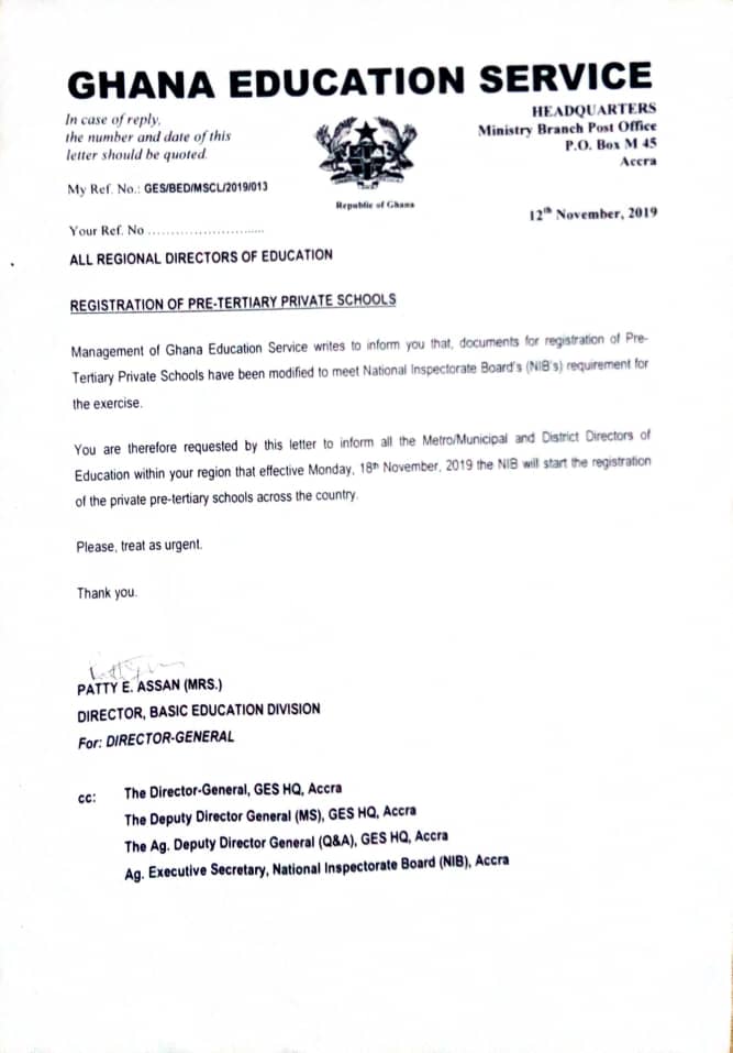 DISCLAIMER The Leadership of GNACOPS have sighted a letter purportedly coming from the Ghana Education Service, claiming to have modified certain parts of its regulations in line with National Inspectorate Authority’s guidelines for inspection/registration and addressed to Regional, District, Municipal Directors etc. There is another specifically addressed to the Bono, Bono East and Ahafo Regions with timelines for inspection.Recent communication also indicate that the *GES* is demanding that schools produce a GES Certificate before their schools’ BECE registration can be processed. This information is completely False and has no basis whatsoever. The Ministry has not approved such unreasonable demands by an agency that no more possess the power to register and there is no such document as GES Certificate anymore. Any school or private candidate who has fallen victim to this extortion should report the case to the Ministry through the NED of GNACOPS for proper sanctions to be applied to whichever Director or Exams Officer engaging in this illegality and denying schools and candidates their constitutional rights. We wish to emphasize here that the Ghana Education Service does NOT have the mandate to inspect and register schools. It is only the NIB (National Inspectorate Board), also referred to as the NIA(National Inspectorate Authority), that has been vested with the authority to inspect and register schools and *NOT* the GES. This has been re-emphasised over and over and very recently by the Executive Secretary, Dr. Hilda Ampadu. For emphasis, it is only the National Inspectorate Board that has the mandate to inspect and register your schools. Do not entertain or pay monies to any group if they are not coming from the *NIB*. In due course, when on-going negotiations have been concluded, you will be furnished with final details and charges by the NED of GNACOPS. For further clarification please contact the NED (GNACOPS) on 0249641349 Thank you. STEVE REVSS, NATIONAL DIRECTOR, Int.Rel.,Mnt., Bus-Int. (0276111999) For and on behalf of the NED and GNACOPS Executive Council. The attached are the controversial letters from GES